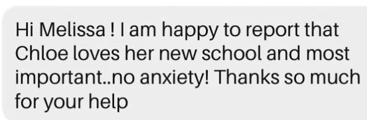 Now she is free to enjoy her new school, make new friends, and grow in confidence and self esteem from the inside out, with, as mom says, “NO ANXIETY!”